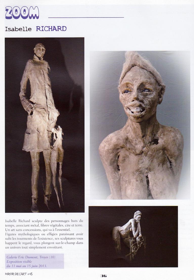 Isabelle Richard sculpte des personnages hors du temps, associant métal, fibres végétales, cire et terre. Un art sans concessions, qui va à l'essentiel. Figures mythologiques on effigies paraissant avoir subi les tourments de l'existence, ses sculptures vous happent le regard, vous plongent sur-le-champ dans un univers tout simplement envoûtant.